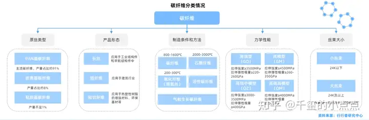 碳纤维的分类:按原丝类型分类:聚丙烯腈(PAN)基、沥青基(各向同性、中间相);粘胶基(纤维素基、人造丝基)。按产品形态分为长丝、短纤维、短切纤维。按制造条件和方法分类:碳纤维、石墨纤维、氧化纤维、活性碳纤维、气相生长碳纤维。按力学性能可分为通用型和高性能型:通用型碳纤维强度约1000MPa、模量约100GPa;高性能型又分为高强型和高模型,超高强型及超高模型。按丝束大小可分为小丝束和大丝束:小丝束碳纤维初期以1K、3K、6K为主,逐渐发展为12K和24K,应用于航空航天、体育休闲等领域。通常将48K以上碳纤维称为大丝束碳纤维,包括48K、60K、80K等,应用于工业领域。