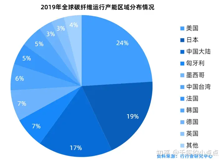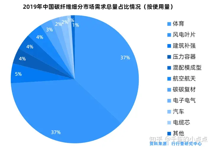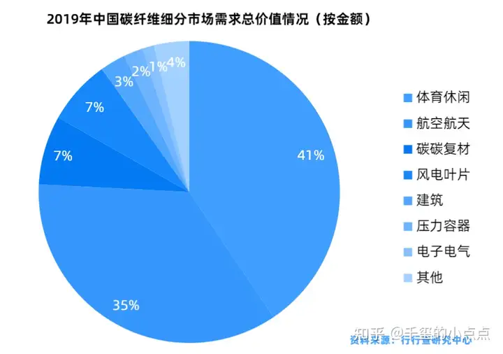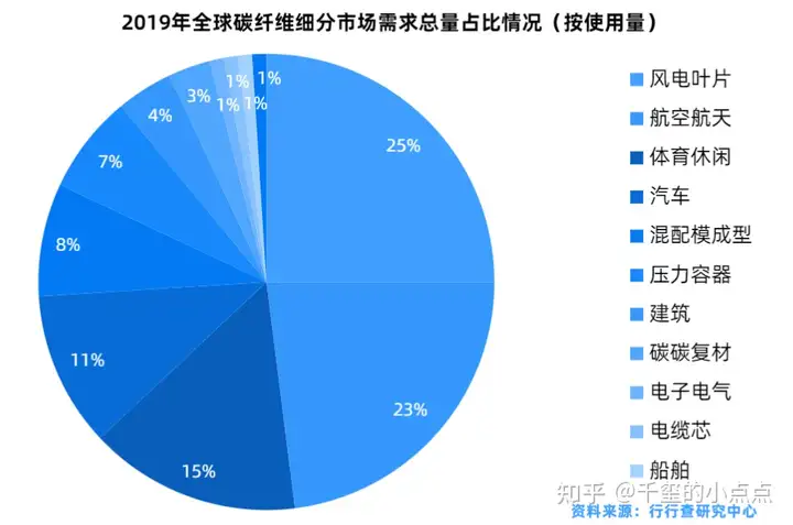 全球的碳纤维主要应用在风电、航空航天、体育休闲和汽车等细分行业,具体来看2019年风电和航空航天是碳纤维最大的应用领域,分别占总需求的25%和23%,其次是体育休闲占到15%的市场份额,汽车位列第四占据11%的市场份额。