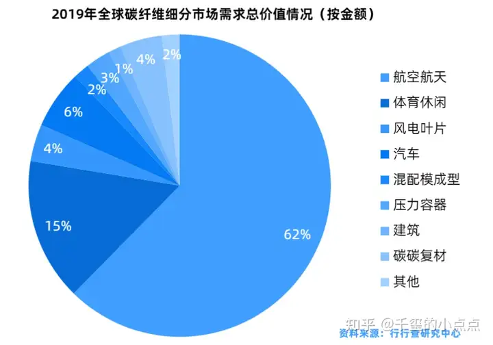 全球的碳纤维主要应用在风电、航空航天、体育休闲和汽车等细分行业,2019年风电和航空航天是碳纤维最大的应用领域,分别占总需求的25%和23%,其次是体育休闲占到15%的市场份额,汽车位列第四占据11%的市场份额。从金额上航空航天占据碳纤维市场的一半左右,这主要是由于其行业的特殊性所致,飞机和航空器制造对于碳纤维的强度、寿命和稳定性等性能指标要求极为严格,因此航空航天级别的碳纤维价格远远高于其他行业所需要的碳纤维。