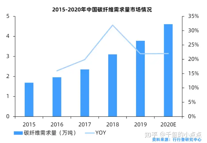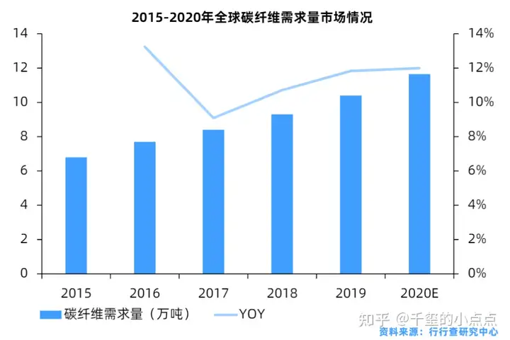 本世纪随着航空工业的复苏、风电行业的迅猛发展以及汽车工业引入碳纤维车身,碳纤维的应用领域进一步扩展,尤其是近5年,全球碳纤维的需求量几乎实现了翻倍。