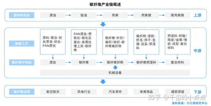 碳纤维产业链包括上游的原材料供应,中游的原丝加工、碳纤维相关产物以及碳纤维复合材料生产加工、核心机械制造以及下游的应用市场组成。核心环节为中游的原丝、碳纤维、织物、预浸料、复合材料等步骤,占据整个产业链成本的一半以上。