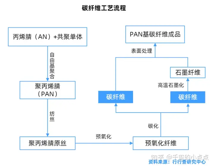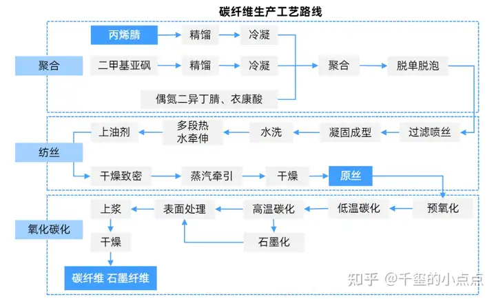 PAN基碳纤维在碳纤维中占比90%以上。聚丙烯腈(PAN)基碳纤维的生产主要包括原丝生产和原丝碳化两个过程,原丝生产过程主要包括聚合、脱泡、计量、喷丝、牵引、水洗、上油、烘干收丝等工序;碳化过程包括放丝、预氧化、低温碳化、高温碳化、表面处理、上浆烘干、收丝卷绕等工序。